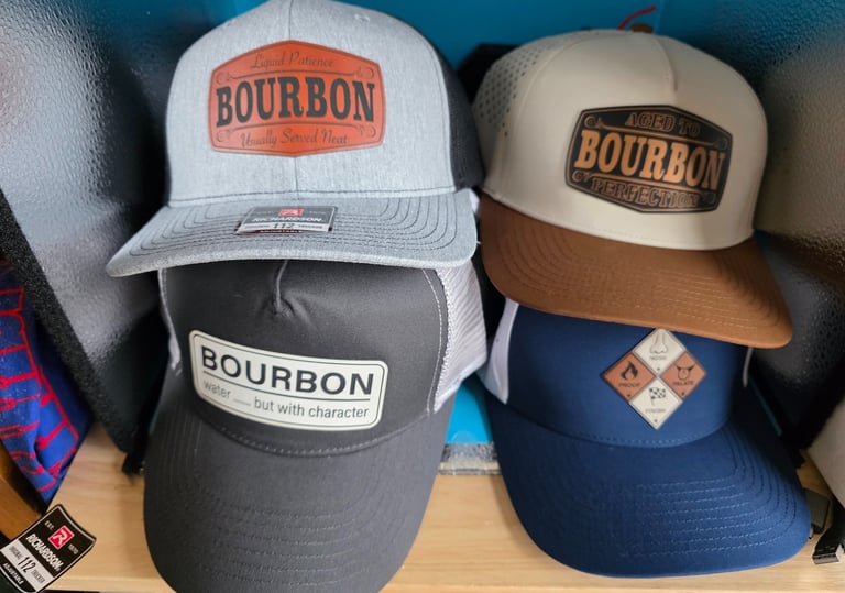 The Method: We specialize in creating custom-etched patches—using leather, leatherette, or specialized acrylic—and permanently bonding them to high-quality headwear.